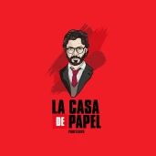 A nagy pénzrablás című sorozat főszereplőjéről készült portré és a sorozat logója.