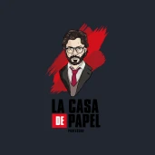 A nagy pénzrablás című sorozat főszereplőjéről készült portré és a sorozat logója.