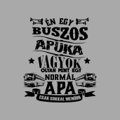 Buszos Apuka vagyok pólóminta egyszerűen a Te pólódon is. Válassz további mintáink közül a(z) Apának kategóriában, vagy tervezz egyedi pólót online gyorsan! Pólómánia - A Te stílusod!