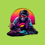 Vagány DJ majom napszemüvegben és fejhallgatóban, retró synthwave hangulatban. Tökéletes póló, bögre vagy párna mintának.