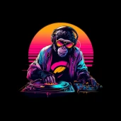 Vagány DJ majom napszemüvegben és fejhallgatóban, retró synthwave hangulatban. Tökéletes póló, bögre vagy párna mintának.
