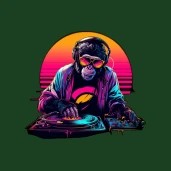 Vagány DJ majom napszemüvegben és fejhallgatóban, retró synthwave hangulatban. Tökéletes póló, bögre vagy párna mintának.