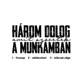 Három dolog amit szeretek a munkámban pólóminta egyszerűen a Te pólódon is. Válassz további mintáink közül a Munkahelyi kategóriában, vagy tervezz egyedi pólót online gyorsan! Pólómánia - A Te stílusod!