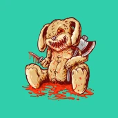 Hátborzongató, véres nyúlbaba, baltával és tőrrel
