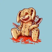 Hátborzongató, véres nyúlbaba, baltával és tőrrel