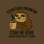 Ez a kép egy álmos, kávéját szorongató lajhárt ábrázol, aki teljesen átérzi a hétköznapi munkanapok fáradtságát. A rajta lévő szöveg humorosan kifejezi a munka szeretetét, miközben a gyakori jelenlét kihívásait is megfogalmazza.