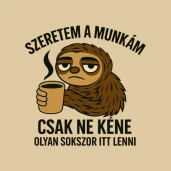 Ez a kép egy álmos, kávéját szorongató lajhárt ábrázol, aki teljesen átérzi a hétköznapi munkanapok fáradtságát. A rajta lévő szöveg humorosan kifejezi a munka szeretetét, miközben a gyakori jelenlét kihívásait is megfogalmazza.
