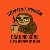 Ez a kép egy álmos, kávéját szorongató lajhárt ábrázol, aki teljesen átérzi a hétköznapi munkanapok fáradtságát. A rajta lévő szöveg humorosan kifejezi a munka szeretetét, miközben a gyakori jelenlét kihívásait is megfogalmazza.