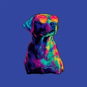 Vagány retro stílusú kutya napszemüvegben, élénk neon színekkel. Tökéletes póló, bögre vagy párna mintának.