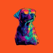 Vagány retro stílusú kutya napszemüvegben, élénk neon színekkel. Tökéletes póló, bögre vagy párna mintának.