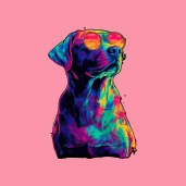 Vagány retro stílusú kutya napszemüvegben, élénk neon színekkel. Tökéletes póló, bögre vagy párna mintának.