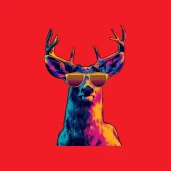 Vagány retro stílusú szarvas napszemüvegben, élénk neon színekkel. Tökéletes póló, bögre vagy párna mintának.