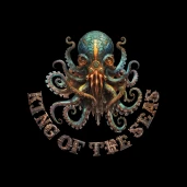 Steampunk póló polippal és "King of the seas" felirattal. A felirat gépi, steampunk stílusban.