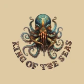 Steampunk póló polippal és "King of the seas" felirattal. A felirat gépi, steampunk stílusban.