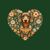 Bájos tacskó illusztráció virágos, szív alakú kompozícióban.