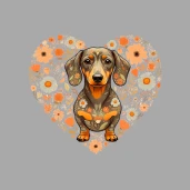 Bájos tacskó illusztráció virágos, szív alakú kompozícióban.